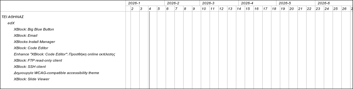 Λειτουργικότητα #453: XBlock: Big Blue Button Λειτουργικότητα #454: XBlock: Email Λειτουργικότητα #455: XBlocks Install Manager Λειτουργικότητα #456: XBlock: Code Editor Λειτουργικότητα #457: Enhance "XBlock: Code Editor": Προσθήκη online εκτέλεσης Λειτουργικότητα #458: XBlock: FTP read-only client Λειτουργικότητα #459: XBlock: SSH client Λειτουργικότητα #460: Δημιουργία WCAG-compatible accessibility theme Λειτουργικότητα #461: XBlock: Slide Viewer
